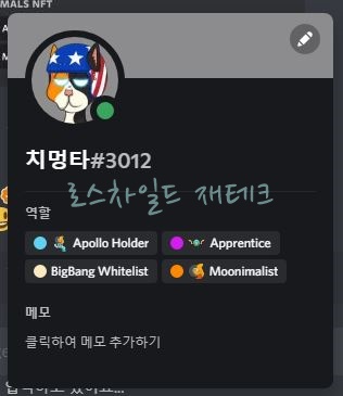 무니멀스-Moonimals 디스코드에서 레벨이 10 이상이 되거나, Apollo holder가 되시면 됩니다. Apollo holder는 개인 지갑으로 NFT 거래소에서 직접 무니멀스-Moonimals Apollo를 구매하시면 됩니다. 현재 민팅 가격보다 좀 올랐기 때문에 잘 판단하시는 게 좋을 것 같습니다. 최초 민팅 가격은 150 ADA였는데 현재 최저 가격이 275 ADA 정도 합니다. 매물도 나온 것도 별로 없네요