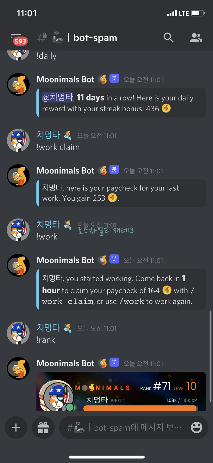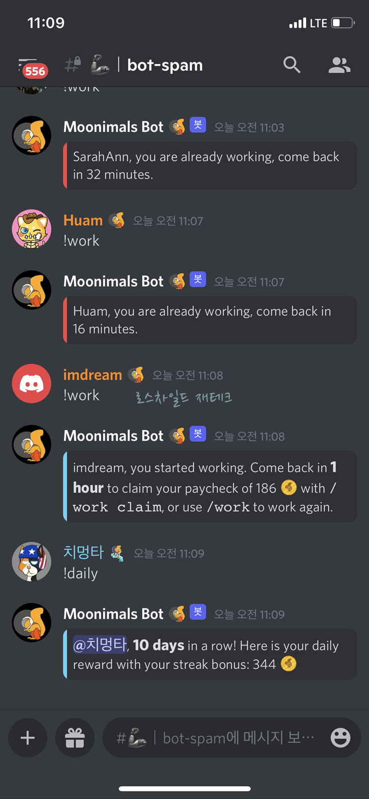 디스코드 내에서 봇 굴을 이용하여 코인을 채굴할수 있습니다, 그리고 그 코인을 갖고 렙업에 필요한 경험치를 구매할 수 있습니다. 'bot-spam' 이라는 게시판에서 코인을 채굴할수 있습니다. '!daily' 라는 명어를 치면 매일 하루에 한번씩 코인을 채굴하고 있으면 연속적으로 하시면 더 많이 채굴 되는 것 같습니다. 아래 그림을 보시면 10일 연속 채굴을 했고 344 코인을 획득하신 것을 확인할 수 있습니다.