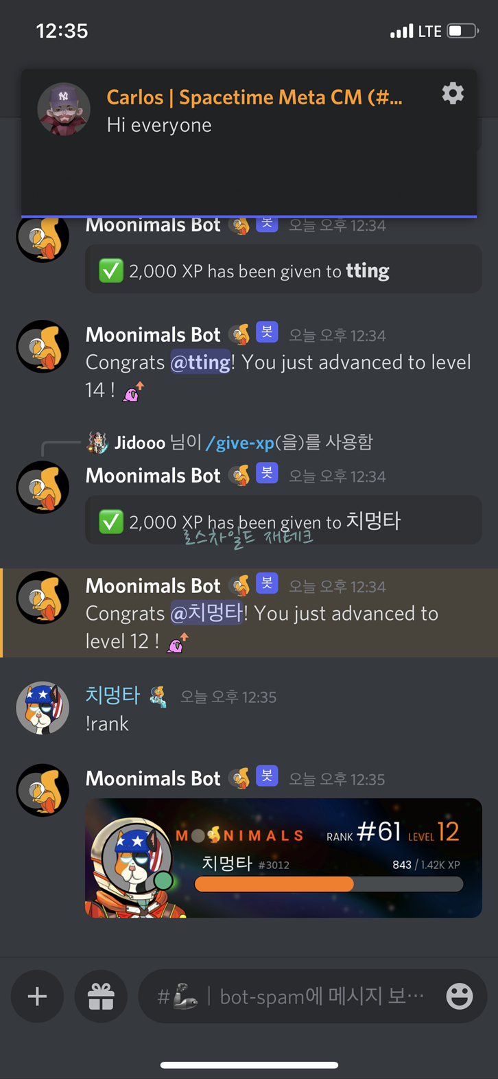 디스코드에서 레벨을 올릴 수 있는데, 방법은 채팅을 하는 방법과 봇을 이용한 방법이 있습니다. 채팅을 이용하는 방법을 '챗 굴' 봇을 이용하는 방법을 '봇 굴'이라고 합니다. 채굴한다는 의미입니다. 먼저 무니멀스-Moonimals 디스코드에 들어옵니다.