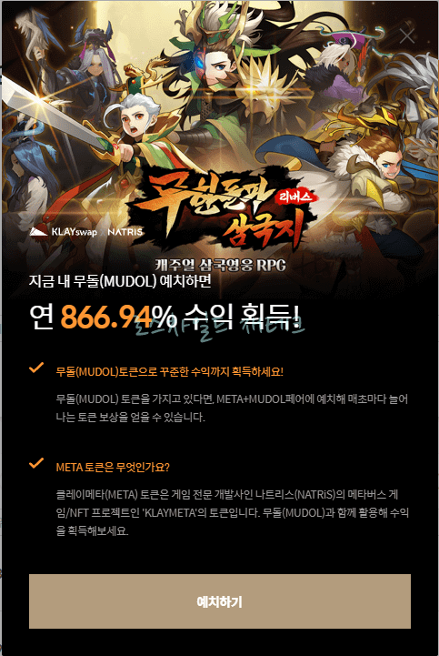 요즘 무한 돌파 삼국지 리버스로 무돌 (MUDOL) 코인을 열심히 채굴하고 있는 로스차일드입니다. 채굴한 무돌 (MUDOL) 코인을 클레이 스왑에서 클레이로 스왑도 가능하시만, 풀에 예치하여 년 900~800%의 수익을 올릴 수 있어 공유드리도록 하겠습니다.