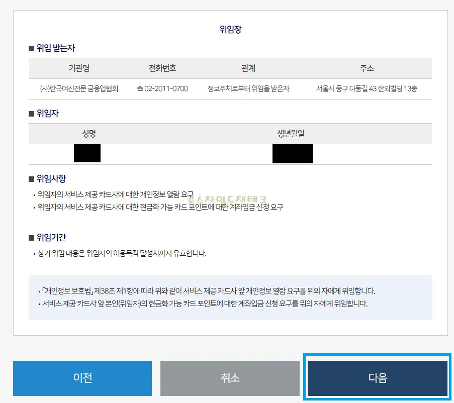 4. 카드 포인트 조회 및 계좌 입금 서비스를 이용을 위한 위임 동의 필요