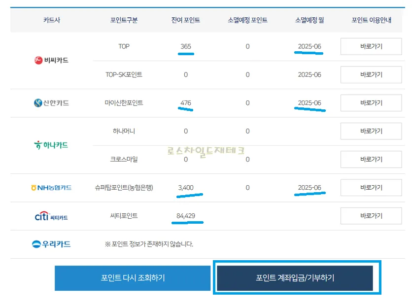 6. 카드 포인트 통합조회를 하면 아래와 같이 본인의 갖고 있는 여러카드의 잔여 포인트를 조회할 수 있습니다. 소멸 예정일도 함께 표기되니 소멸 전 미리 현금화하시기 바랍니다. 포인트 계좌입금/기부하기를 클릭합니다.