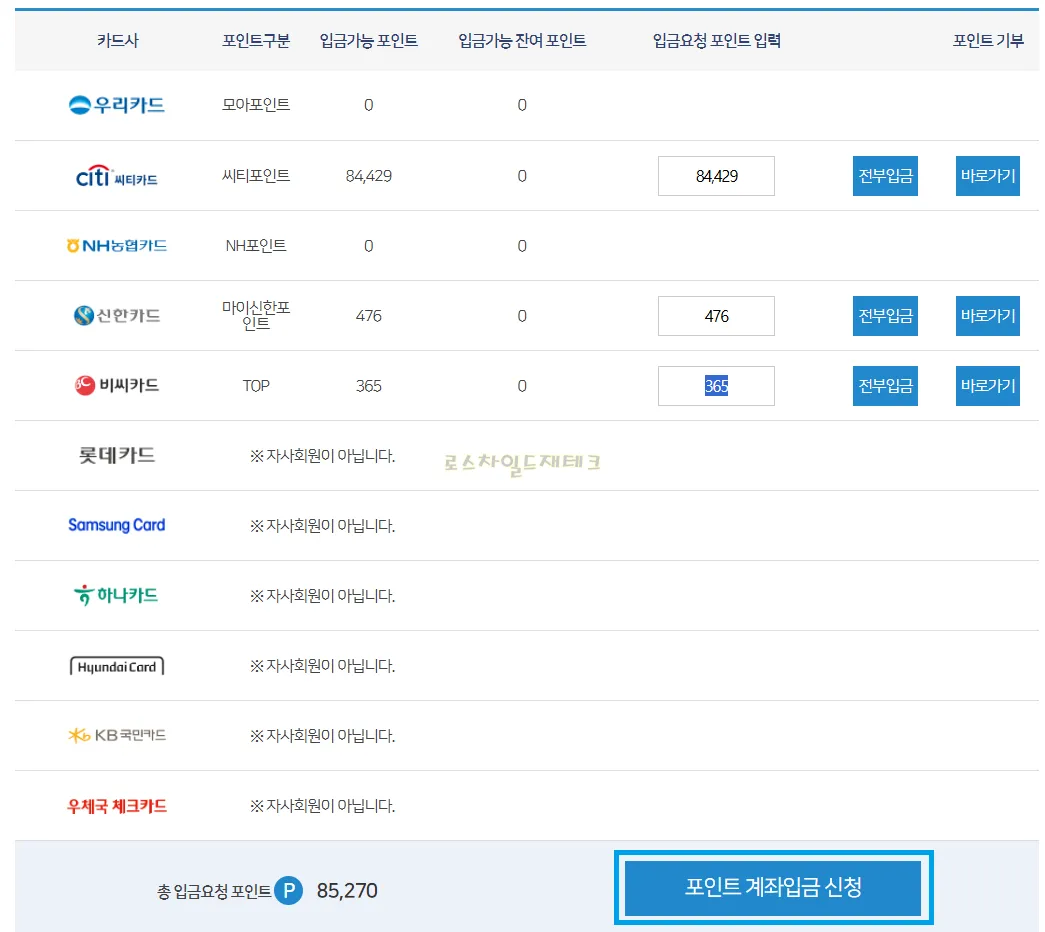 7. 입금 요청 포인트를 입력 후 포인트 계좌입금 신청 클릭