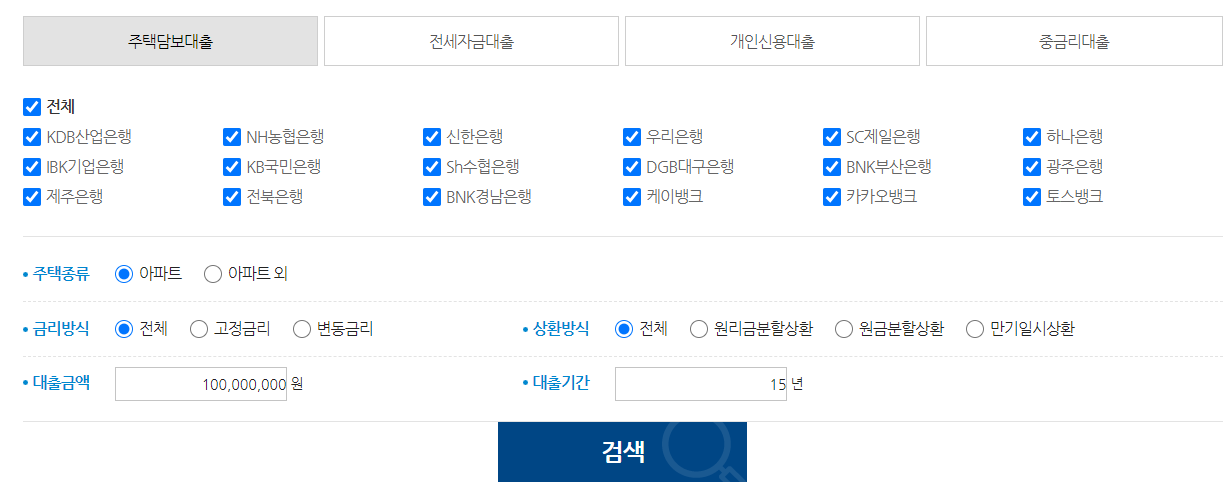 주담대 갈아타기 전, 금리 비교는 필수로 해야 합니다. 금리 비교는 은행연합 소비자 포털에서 쉽게 할 수 있습니다. 은행 선택 후 조건을 선택하여 검색을 하면 국내에 있는 모든 대출 금리를 비교합니다.