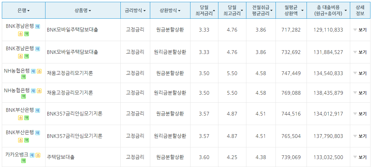 주택담보대출 금리 비교를 해봤습니다. 오늘 기준으로 경남은행의 금리가 가장 낮습니다.
