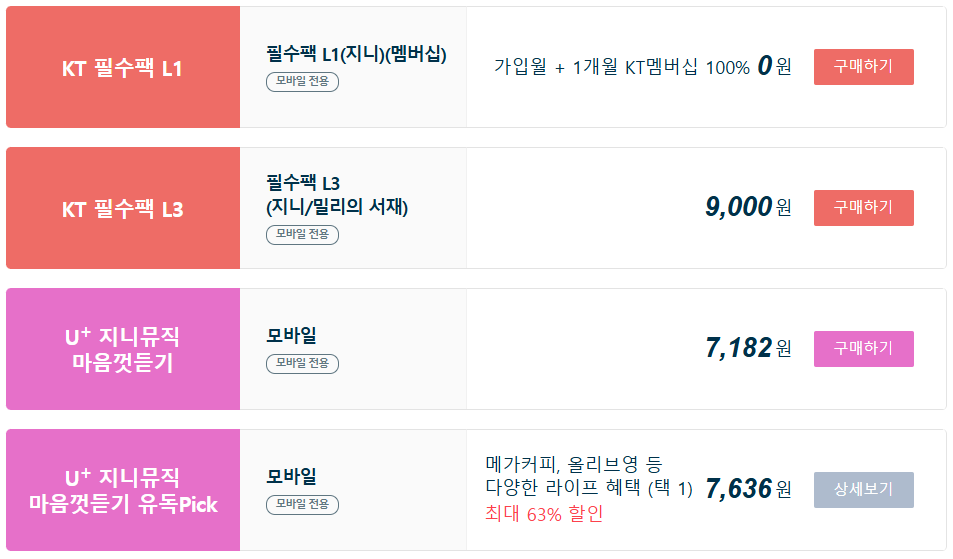 지니뮤직 이용권 종류 및 제휴할인 이용방법 공유하도록 하겠습니다. 지니뮤직은 타 음악 스트리밍에 비해 가격도 저렴하고 할인 상품이 많고 무료로 이용도 가능합니다.