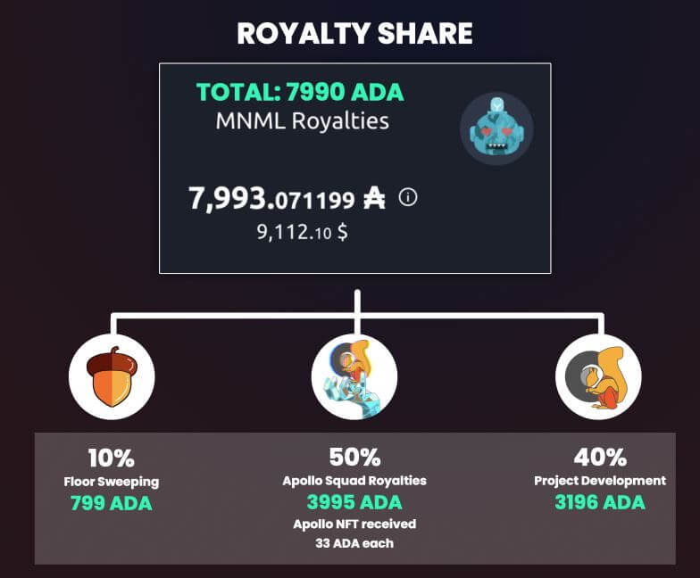 무니멀즈 3월 로열티 쉐어내역을 디스코드에 공개했습니다. 3월 총 7,990 에이다가 모였고, 10% 799 에이다를 바닥줍기 (주식에서 자사주 매입과 동일)에 사용, 50% 3,995 에이다를 분배, 40% 3,196 에이다를 개발팀에서 사용 예정입니다.
