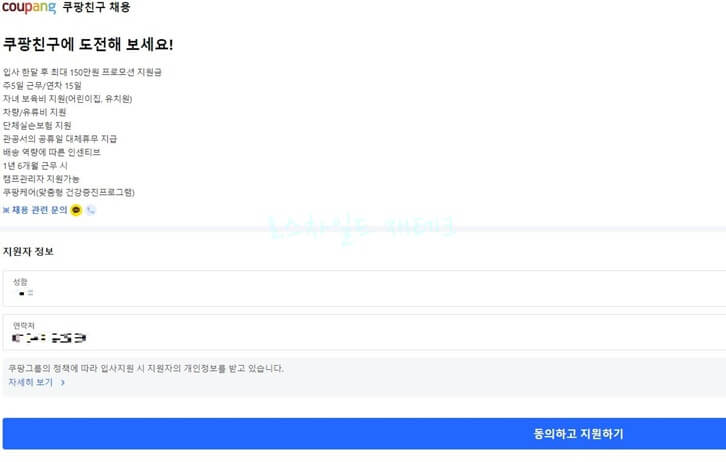 사이트에 들어가시면 아래와 같은 페이지가 나옵니다. 이름와 연락처를 입력하고 '동의하고 지원하기'를 눌러줍니다.