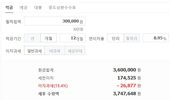 우체국 신한 우정 적금으로 매월 30만원씩 12개월 적금하면 원금은 360만 원이며 이자는 174,525월을 받을 수 있으며 세후로는 147,648원을 받을 수 있습니다.